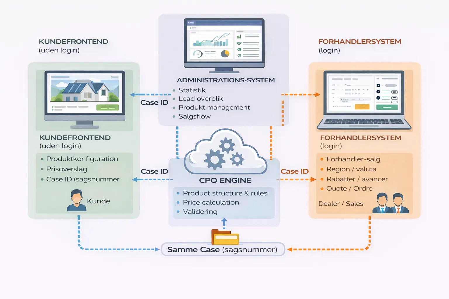 | Formål | Et let og brugervenligt CPQ-tilbudssystem til leadgenerering. Kunden konfigurerer sin løsning og sender en forespørgsel direkte til jer. Systemet indeholder ingen administrations- eller backend-funktioner og anvendes udelukkende til indsamling af kvalificerede leads. | Et CPQ-system med konfiguration, prisberegning og administrationsmodul. Gør det muligt at håndtere forespørgsler, oprette tilbud og administrere data ét samlet sted. Velegnet til virksomheder, der vil effektivisere salgsprocessen fra lead til tilbud med en konfigurator/productfinder. | En fuld CPQ-løsning målrettet internationalt forhandler- og distributionssalg. Understøtter komplekse produktkonfigurationer, differentierede prislister og central styring på tværs af markeder. Ideel til virksomheder med flere forhandlere, lande og valutaer og konfiguratorer. |