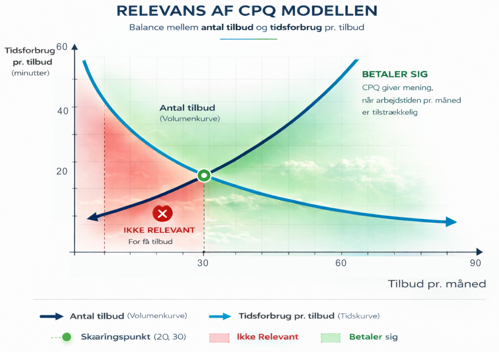 Denne model viser, at kompleksitet har en stor betydning for relevansen af CPQ for dig, da der vil komme et stort udbytte ved at investere i CPQ systemer ved både Lav og Mellem høj kompleksitet, men du bør lade være, hvis du kun arbejder med specialopgaver.