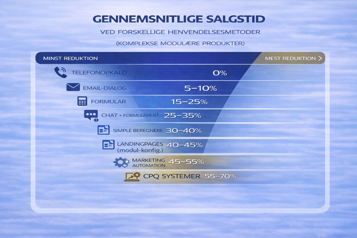 - Når kunden selv kan konfigurere produktet (selvbetjening) og forstå prisen uden at vente på sælger, tilfredsstilles det indledende behov, kunden har for første kontakt.