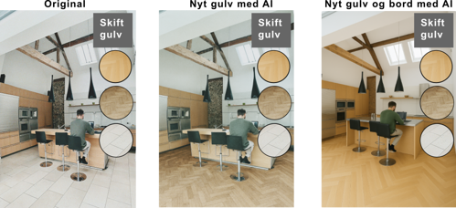 Dette billede er et eksempel på, hvordan en kunde på sitet nemt vil kunne uploade et billede af et køkken og se, hvordan køkkenet ser ud, med et andet gulv en producent sælger.