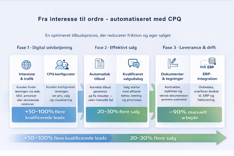 Samtidigt viser analyser at den gode konfigurator kan forbedre lukkeraten i salget med op mod 30%. Tidsbesparelsen ved den godt designede konfigurator kan løbe helt op i 3 arbejdsdage pr. ordre.